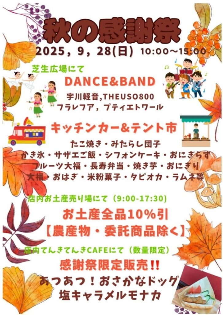 記事のタイトルとURLをコピーする 9月27日(土) 四辻区民まつり 9月28日(日) 阿蘇シーサイドピクニック 9月28日(日) てんきてんき丹後秋の感謝祭 日曜日は2ヶ所での出店になります!お誘い合わせの上お越しください♪ イベント出店のお知らせです 前の記事